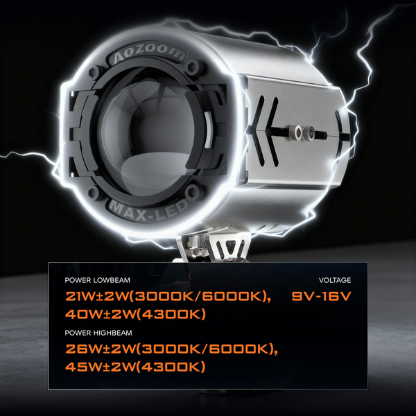 | Power | LOWBEAM: 21W±2W(3000K/6000K), 40W±2W(4300K) HIGHBEAM: 26W±2W(3000K/6000K), 45W±2W(4300K) |