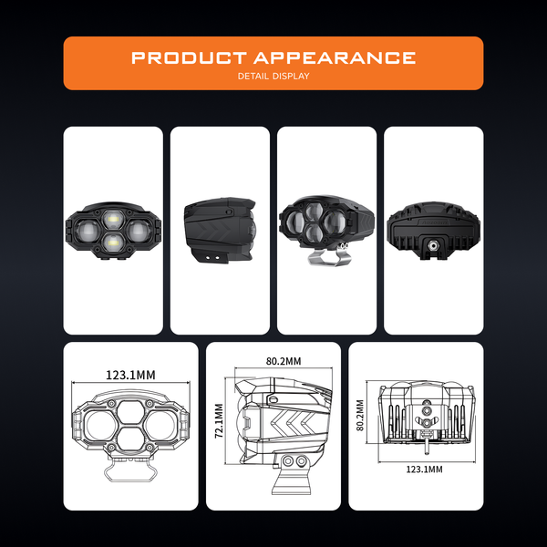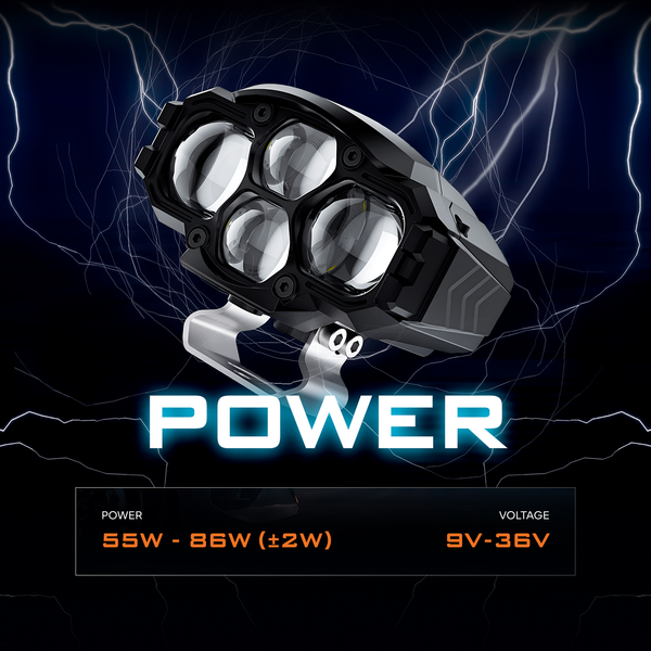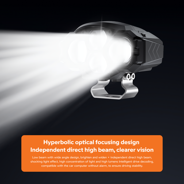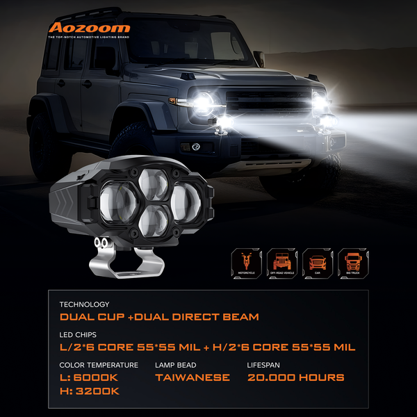 The AOZOOM AE2 PRO LED Extra Lights introduce dual lamp cups + dual direct LED optics, providing superior brightness and beam flexibility. Delivering 55W low beam and 86W high beam, AE2 PRO combines Taiwanese LED chips with dual-color temperature output: 6000K for low beam and 3200K for high beam. This unique feature enhances driving safety in both clear and foggy conditions. Operating within 9V–36V, AE2 PRO offers outstanding performance and stability, making it an ideal upgrade for drivers who want all-weather adaptability and high power in one package.