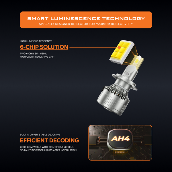 With 5,500 lumens of output, the AH4 LED bulb is a powerful upgrade for any vehicle. Engineered with dual 6-chip 55×55 MIL design, it delivers a clean 6000K white beam that enhances visibility without dazzling oncoming traffic. Reliable across 9–16V systems, it combines safety with energy efficiency.
