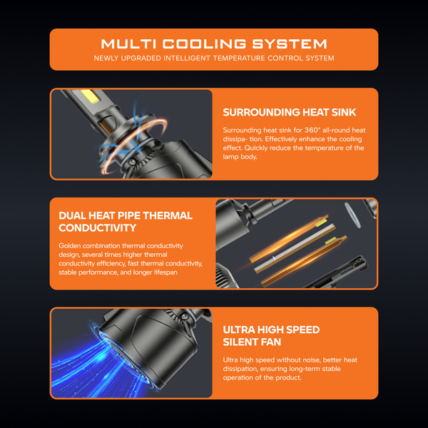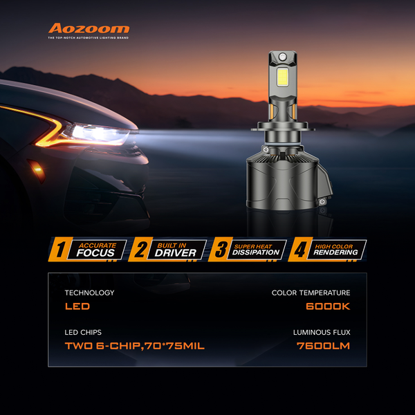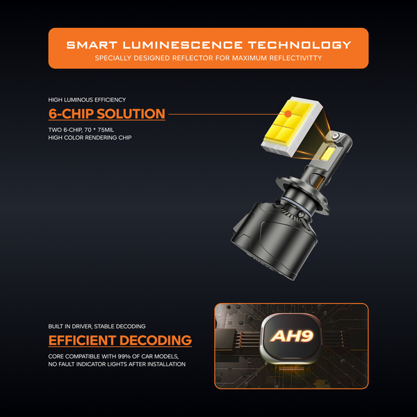 The AH9 LED bulb delivers 7,600 lumens of ultra-bright 6000K light with 120W strength. Its dual 6-chip, 70×75 MIL design creates a focused beam pattern that enhances road safety without glare. Designed for 9–16V vehicles, it’s the perfect upgrade for modern automotive lighting needs.